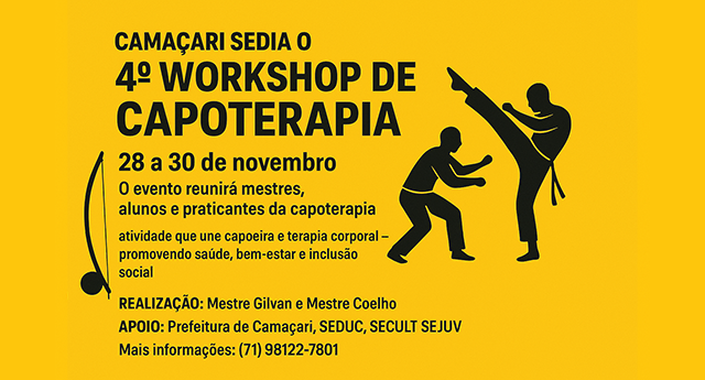 Foto: Reprodução Entre os dias 28 e 30 de novembro, o município de Camaçari será sede do 4º Workshop de Capoterapia, evento que reunirá mestres, alunos e praticantes dessa atividade que une capoeira e terapia corporal, com o objetivo de promover saúde, bem-estar e inclusão social.