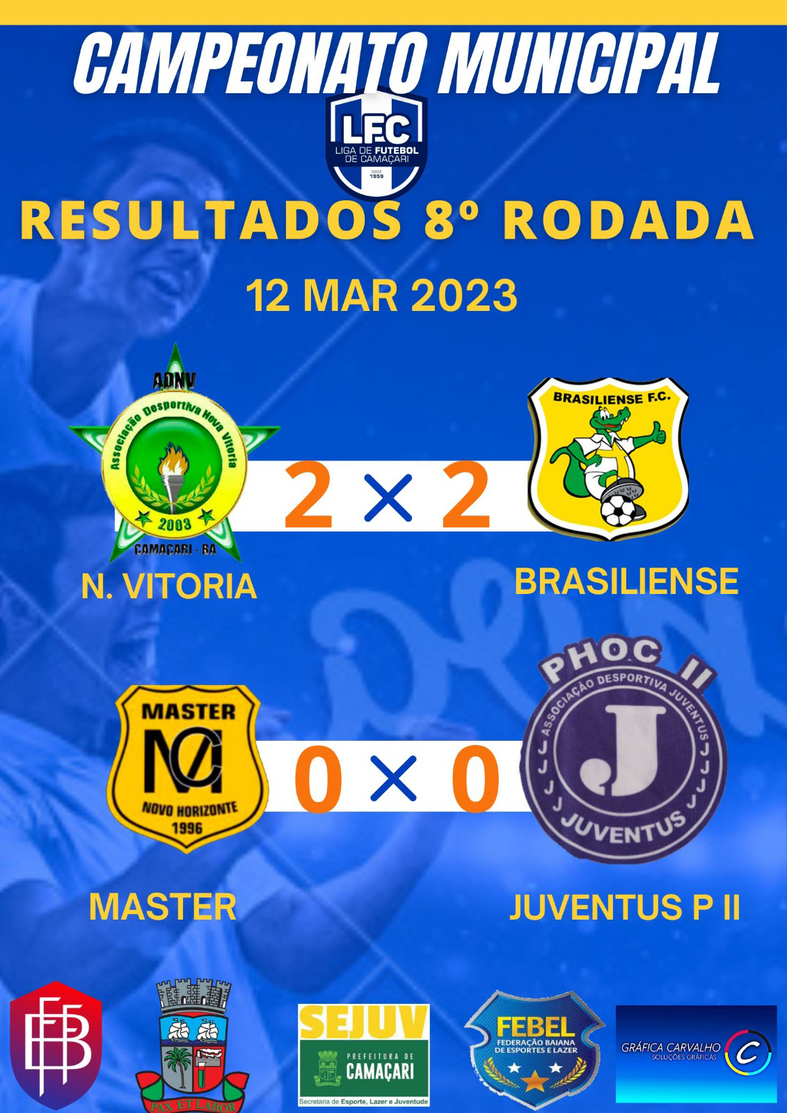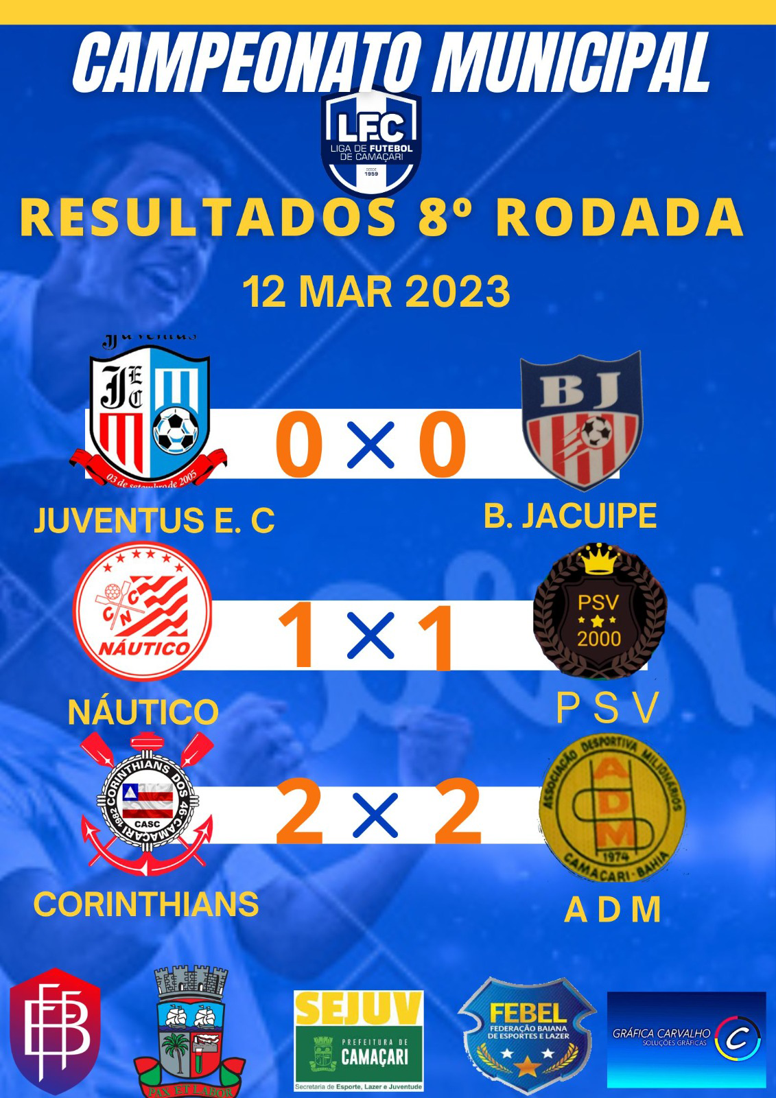 Neste domingo (12/3), o Campeonato Municipal de Futebol Amador movimentou a 8ª rodada. Na sede do município, Náutico e PSV e ADM e Corinthians, jogaram na Arena Gleba E. Já na Arena Burissatuba ocorreram mais dois jogos: Brasiliense e Nova Vitória, e Máster e Juventus. Na costa, os jogos aconteceram na Arena Monte Gordo entre o time da casa e a Juventus. E na Arena Pé de Areias jogaram Vasco e Catu, e Pé de Areias versus Jauá.