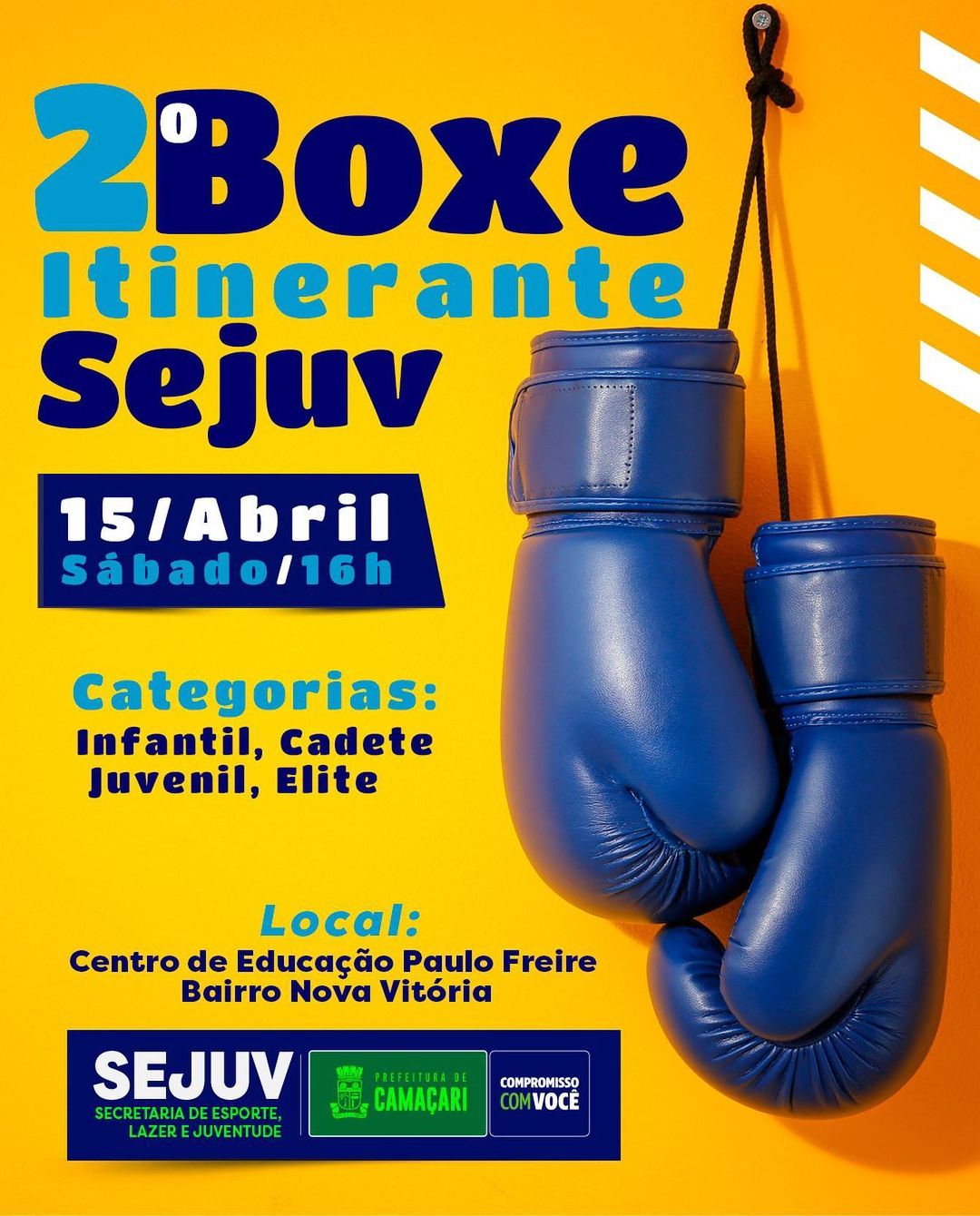 Foto: Reprodução A 2ª edição do projeto Boxe Itinerante Sejuv chega ao bairro Nova Vitória neste sábado (15/4). A atividade, que conta com vinte atletas oriundos de bairros de Camaçari e de cidades da Região Metropolitana de Salvador (RMS), acontece às 16h na quadra poliesportiva do Centro de Educação Municipal Paulo Freire.