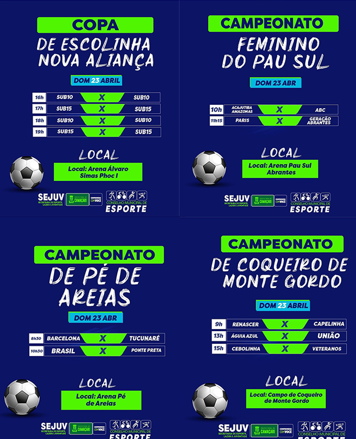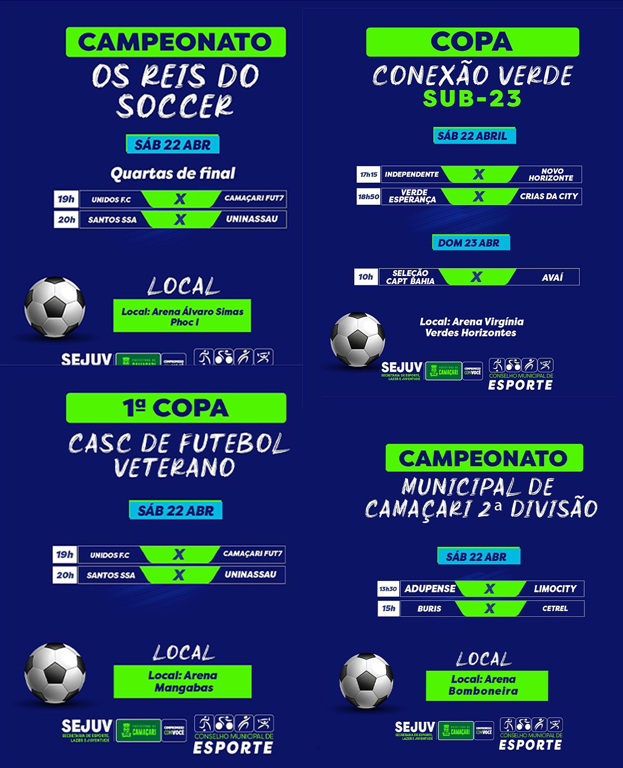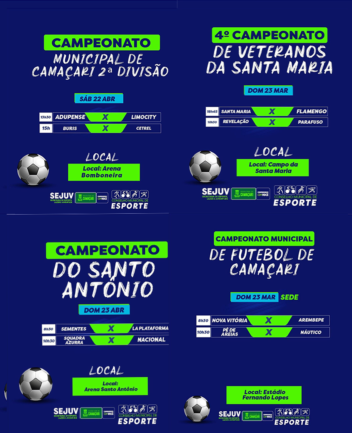 Todas as competições contam com o apoio da Prefeitura de Camaçari, por intermédio da Secretaria do Esporte, Lazer e Juventude (Sejuv).