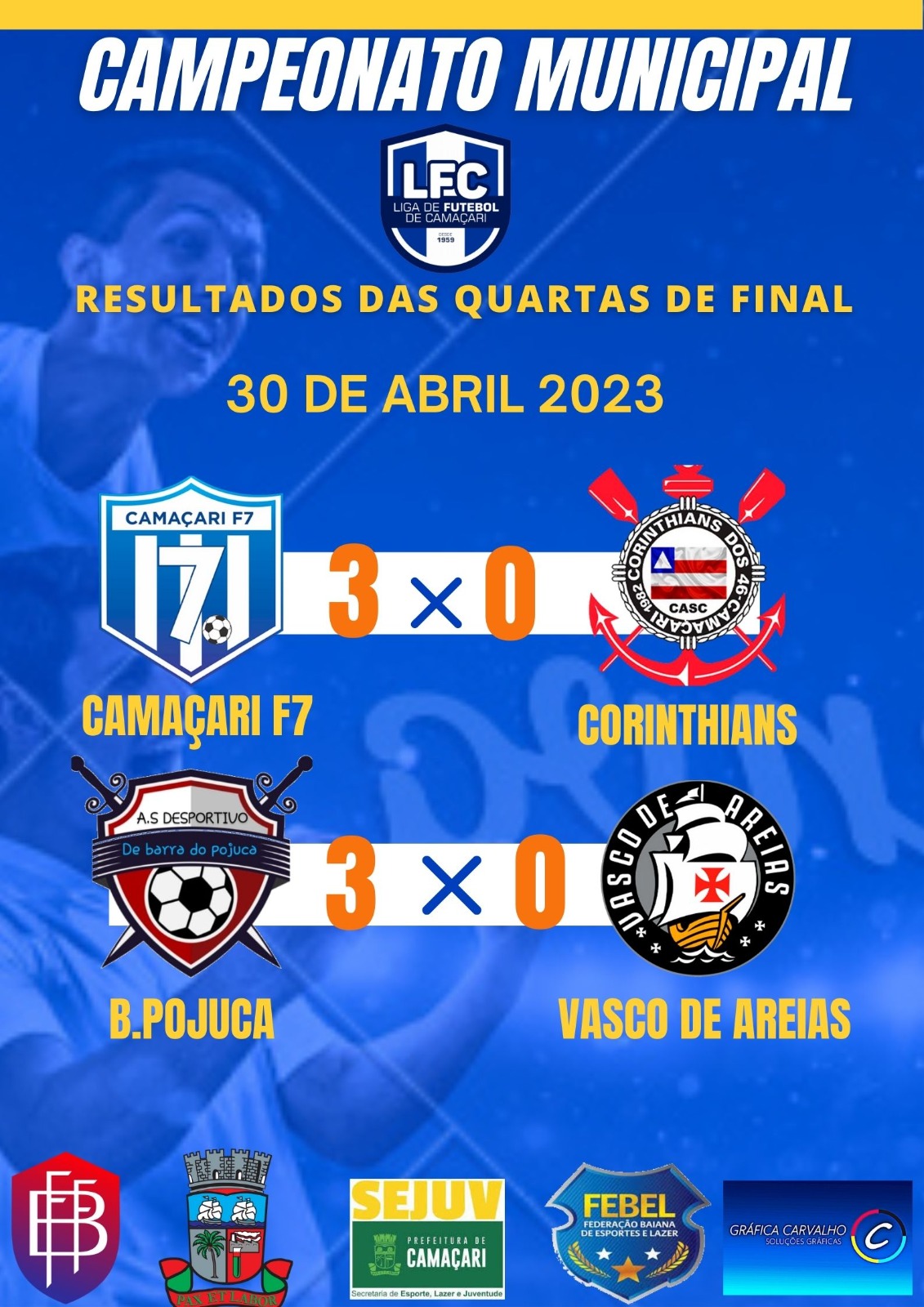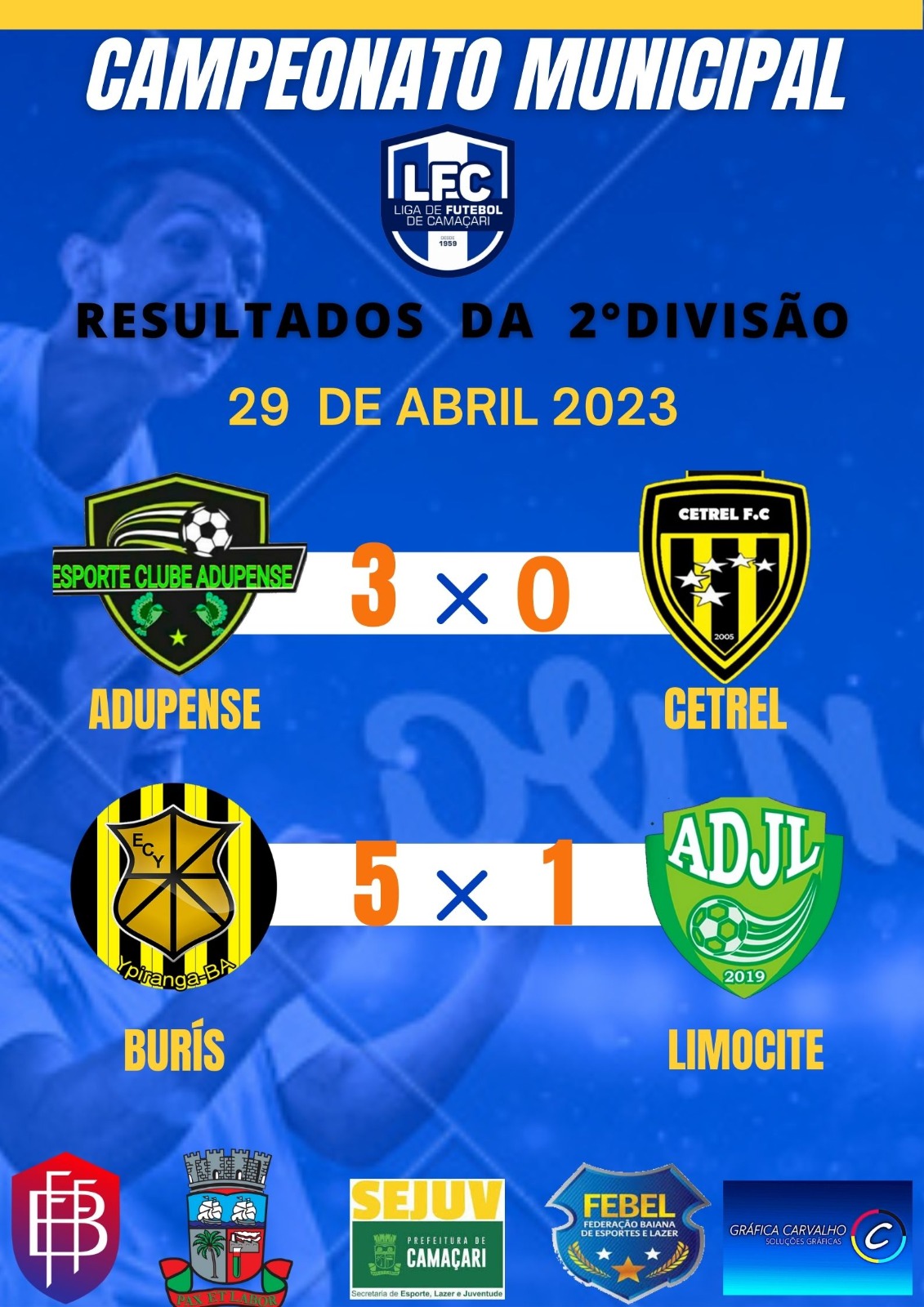 Todos os jogos do Campeonato Municipal da liga de futebol de Camaçari, contam com apoio de FBF (federação Baiana de futebol) da Prefeitura municipal de Camaçari através da SEJUV e da FEBEL (federação Baiana de Esportes e lazer).
