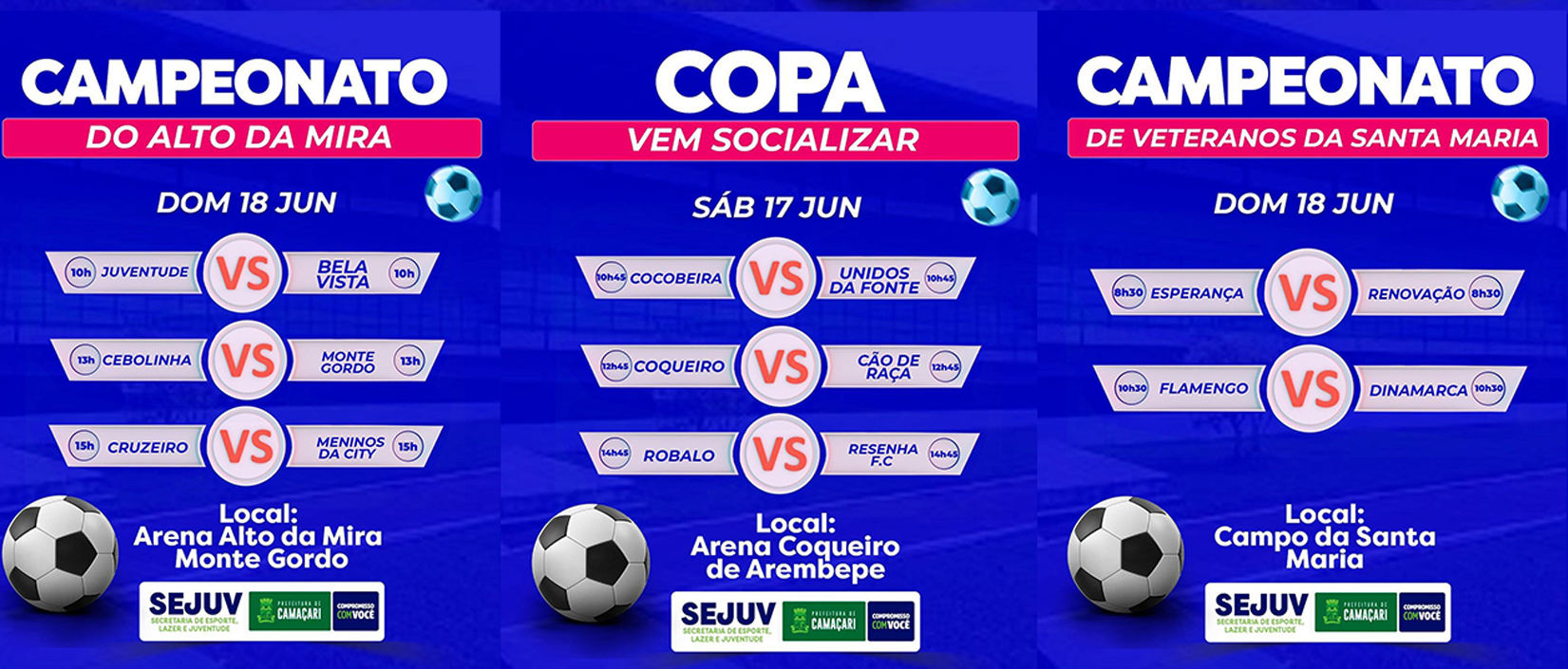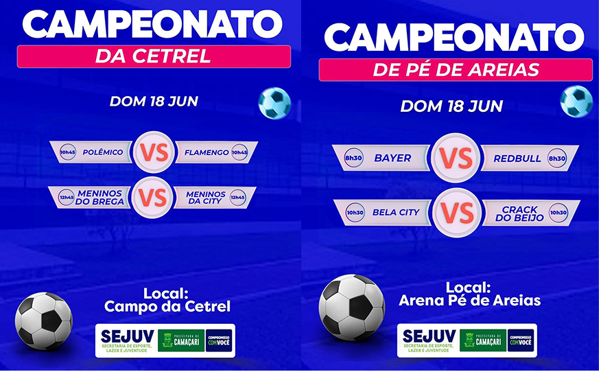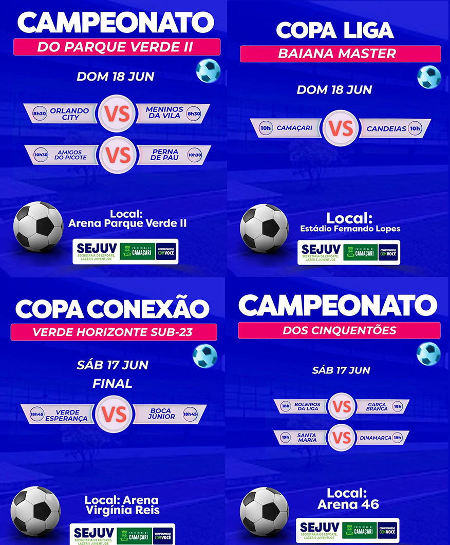 A bola vai rolar neste fim, com vários campeonatos tanto na sede quanto na orla de Camaçari, escolha sua programação e prestigie o nosso esporte, confira nos cards divulgados pela SEJUV: