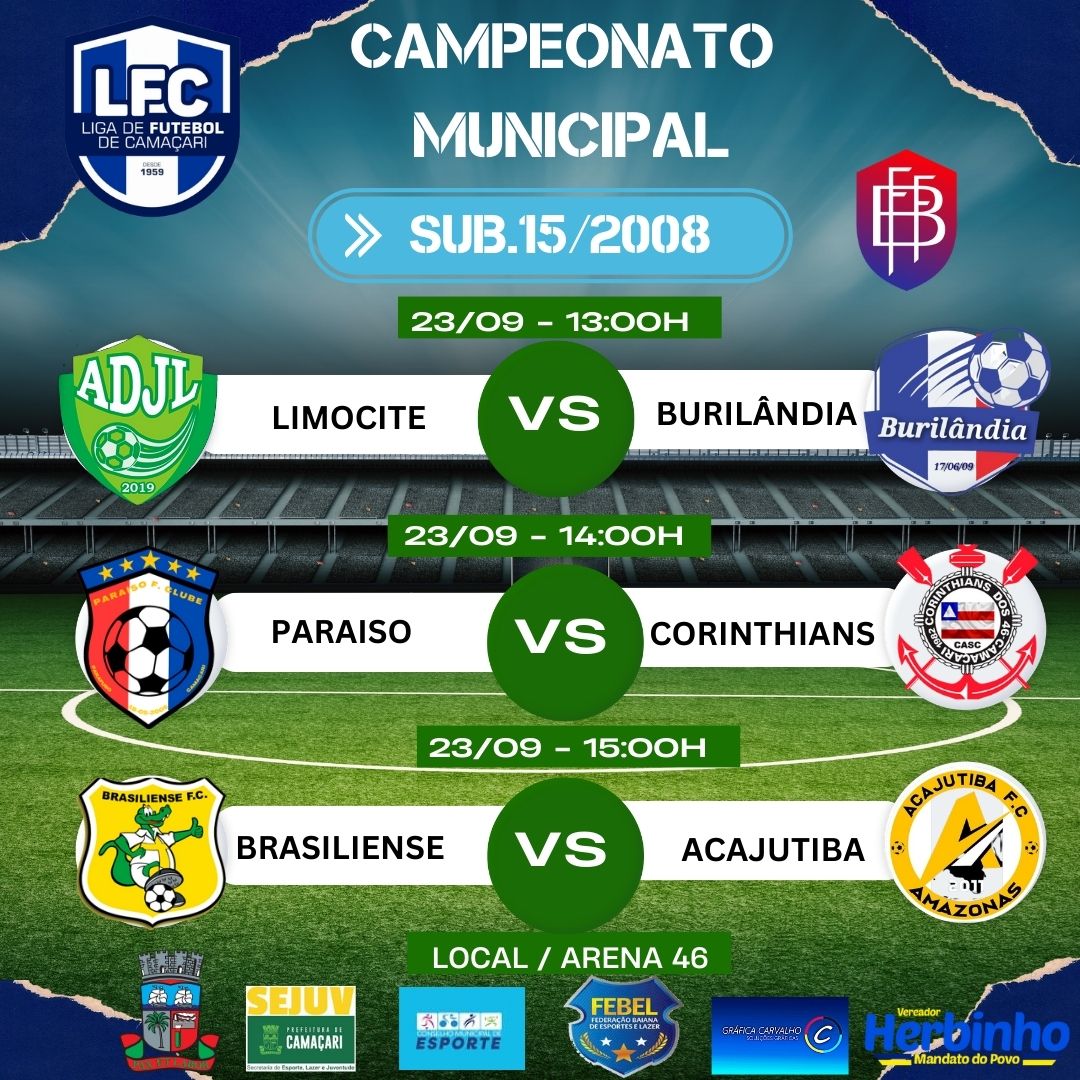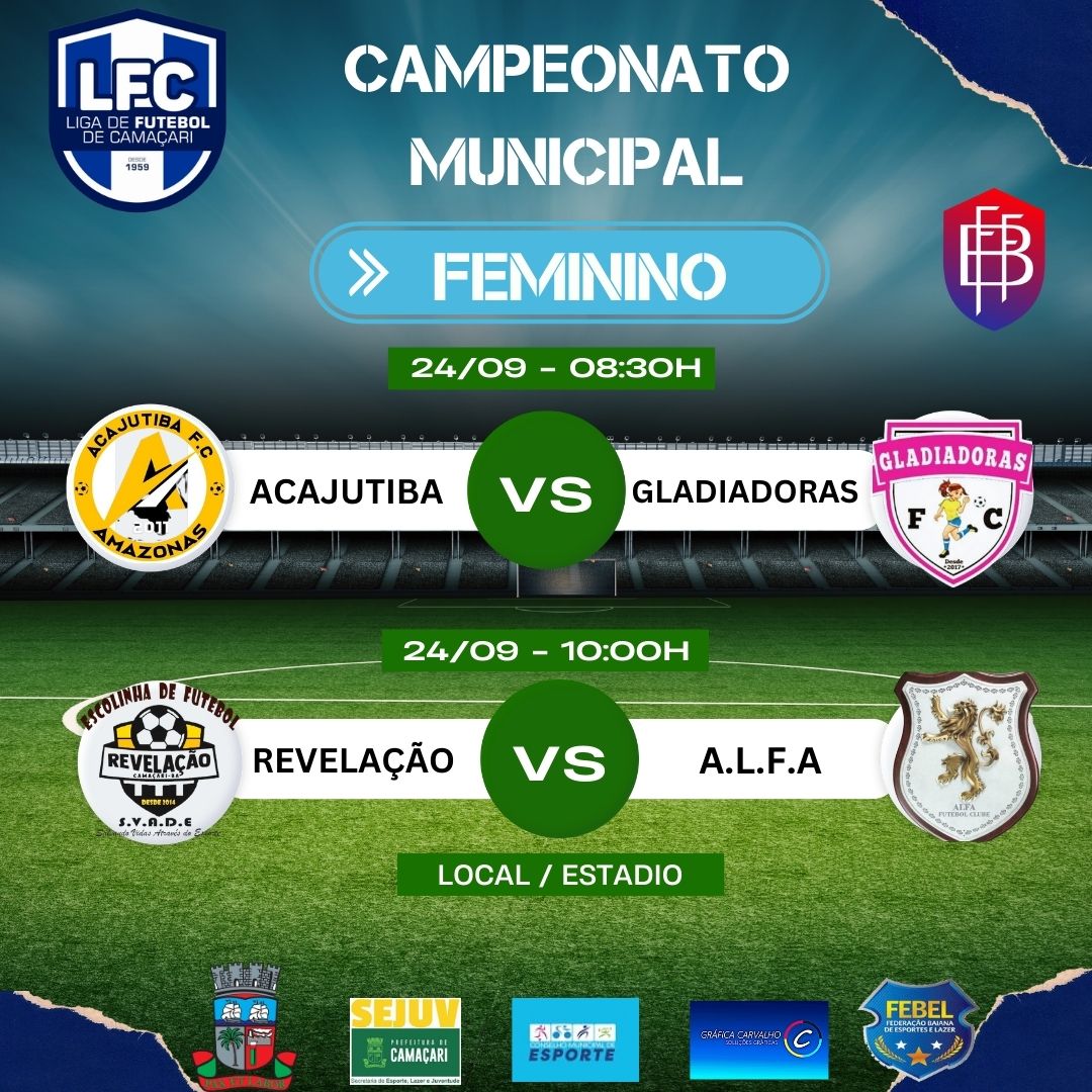 Foto: Reprodução A LFC (liga de futebol e Camaçari) divulgou datas e rodadas do Municipal SUB15 e também do Feminino, o campeonato conta com a apoio da SEJUV (secretária de esporte, lazer e juventude), e vem movimentado o futebol na cidade, confira;